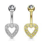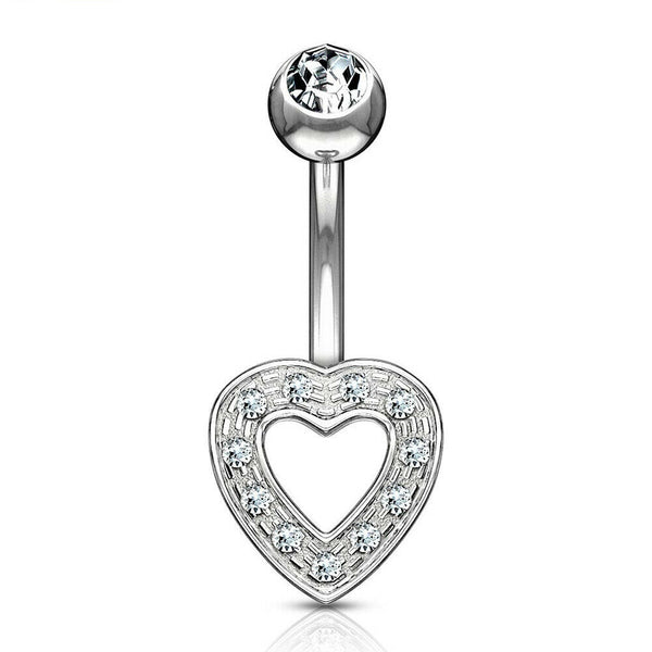 This beautiful belly ring has cubic zirconia jewels that outline the heart shape design.