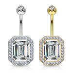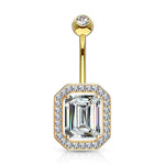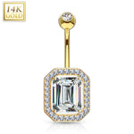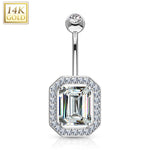 Navel Ring 14 Karat Solid Gold Princess Cut CZ Pronged with Multi Paved Gems Around