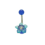 This is a colorful flower UV acrylic belly button ring with a 316L surgical steel shaft and clear CZ gem.