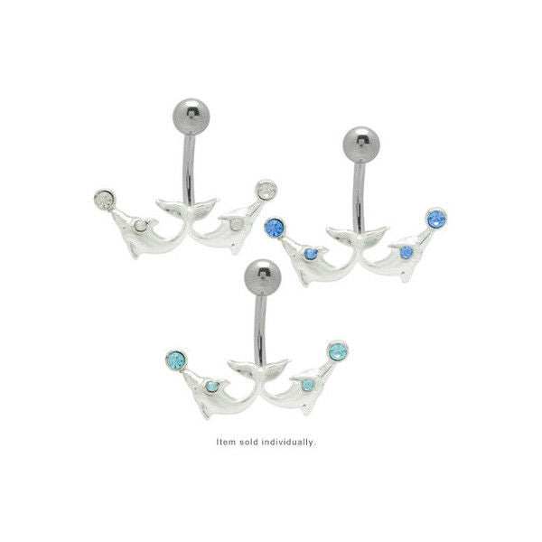 Belly Button Ring Double Jeweled Dolphin DESCRIPTION This a unique duo jeweled dolphin navel barbell. This navel barbell has two dolphins that come out extending sideways with one jewel on...
