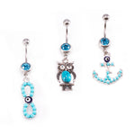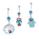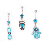 Belly Button Ring Package of 3 with Aqua Jewel and Unique Owl, Anchor, Hamsa Hand, Infinite Love and Owl Navel Dangle Design DESCRIPTION Belly Button Ring Package of 3 with...