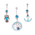 Belly Button Ring Package of 3 with Aqua Jewel and Unique Owl, Anchor, Hamsa Hand, Infinite Love and Owl Navel Dangle Design