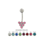 Belly button ring, 316L high-grade surgical steel shaft with six cubic zirconia jewels in your choice of clear, light blue, dark blue, green, purple, red, pink, or turquoise.