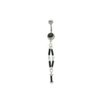 This cool belly ring has an intricate pattern of dangling chain and black beads coming down from a black jeweled bead.