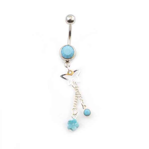 Dangle Belly Ring with Blue flower and Butterfly design 14g Surgical Steel