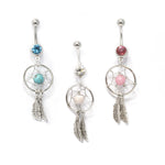 This navel ring has a jeweled bottom bead with a dangling jeweled dreamcatcher.