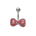 Multi Red Jewel Bow Belly Button Ring DESCRIPTION This is bow tie belly button ring with red cz gems. Features a 316L surgical steel barbell and cz gems. Size thickness...