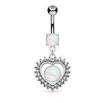 Paved CZ Heart Dangle 14ga Belly Ring with Opal Glitter Center