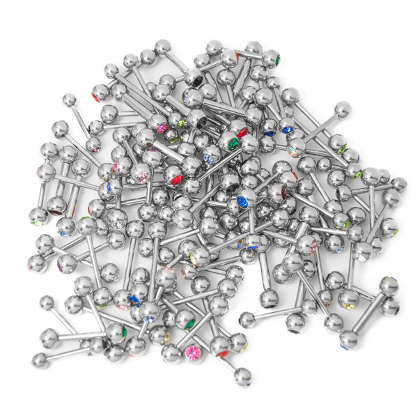 100 Mixed Piercing Barbells - Multi-Color CZ Gems - Mixed Gauges/Lengths - 316L