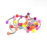 Package includes 20 16G 8MM Long Curved Barbell Eyebrow Rings with Acrylic Glow in the Dark 3mm Ball Ends.