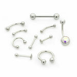 1 curved barbell 16g (3/8" 10mm Length) with jewel, 1 labret 16g (5/16" 8mm Length) , 1 labret 14g (3/8" 10mm Length),