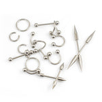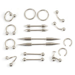18 pieces of jewelry ( eyebrow, horseshoe, rings, twisters, barbells with ball and spike ends)