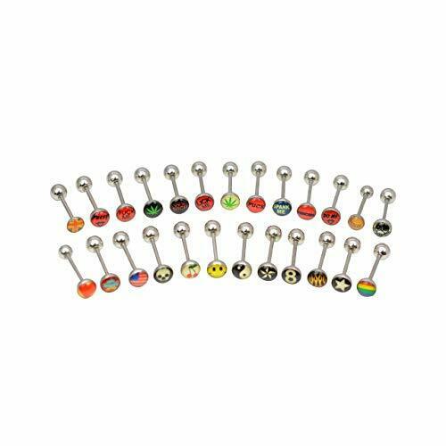 BODY JEWELRY ONLINE Tongue Piercing Barbell 25 pieces - 14ga Logo Tongue Barbell Combo Pack - 316L DESCRIPTION -No Duplicates - Each Tongue Ring has its own unique design-Made of...