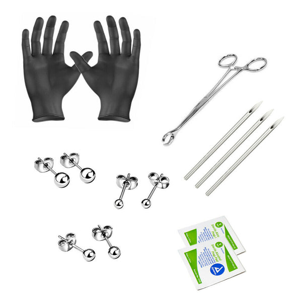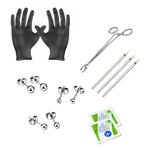 Kit inclde : 1 Stainless steel Clamps 3 18G Sterilized needles 1 pair Gloves 2 Alcohol pads 3 pairs of Titanium Studs 3mm 4mm 5mm ball size