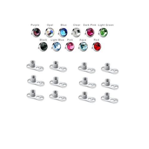 This wholesale deal is for 12 surgical steel internally threaded 4mm jewel dermal tops and 12 bases Dermal gem colors will be in assortments Dermal Top: All one piece machine cut. Fits perfectly onto our dermal anchors. Fits into a 16 gauge base Dermal Base: 316L surgical steel dermal anchor base forlong-termbody implant All-In-One piece solid dermal anchor base Safe for autoclave Made to fit 16GA dermal tops