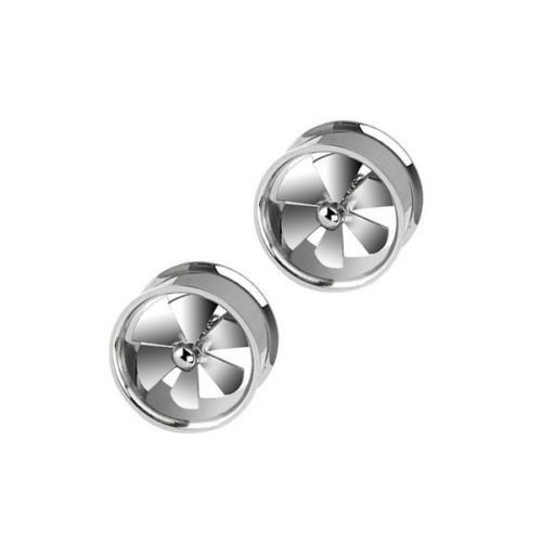 Pair of Spinning Fan Steel Ear Plugs - 0 Gauge to 1 Inch Description This is an awesome spinning fan gauge. This really cool gauge will spin like a fan...