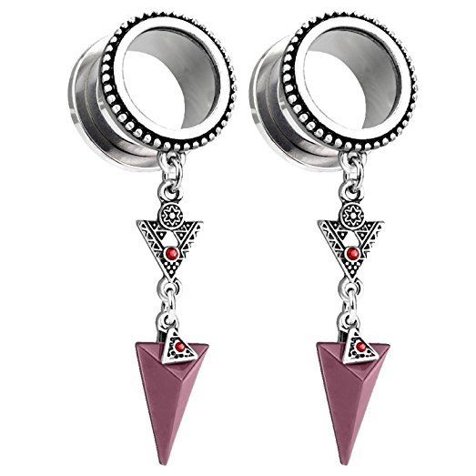 Pair of Surgical Steel Screw Fit Double Flared Ear Plugs w/ Triangle Dangle