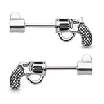 This piece features a highly detailed pistol made of high-quality surgical steel. Perfect for healed piercings and sold in pairs. Just wearing these makes the biggest and boldest statement ever. Shaft measures 14 Gauge with an overall length of 1/2"(12mm).