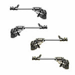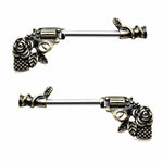 This piece features a highly detailed pistol with a rose handle, made of high-quality surgical steel. Perfect for healed piercings and sold in pairs.