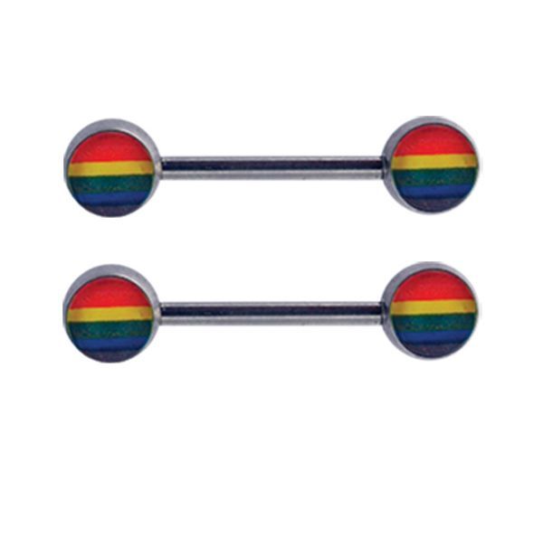 Nipple jewelry with a rainbow design.