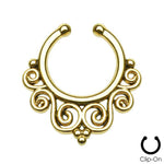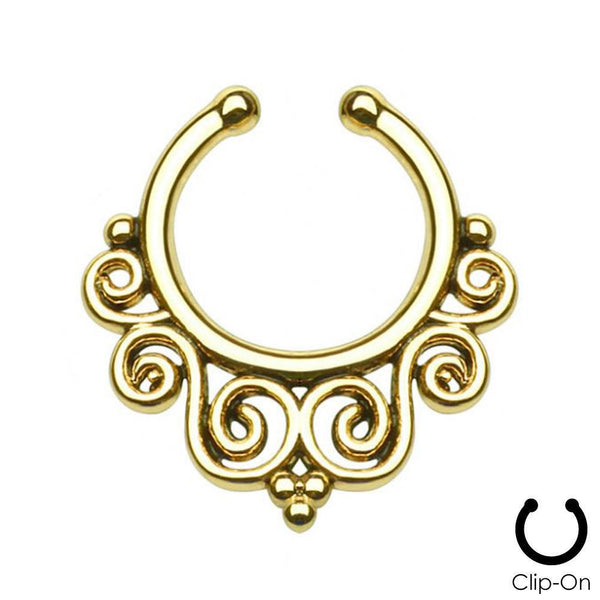 img { max-width: 100%; } Non-Piercing Septum Nose Hanger with Tribal Swirls adjustable size DESCRIPTION Sold each Features a tribal design with filigree swirls Choose from 3 color options: gold,...