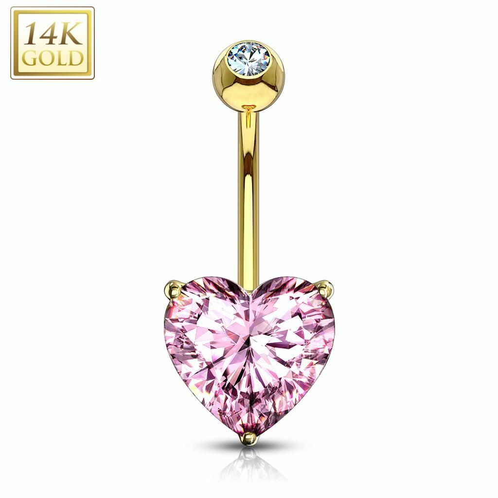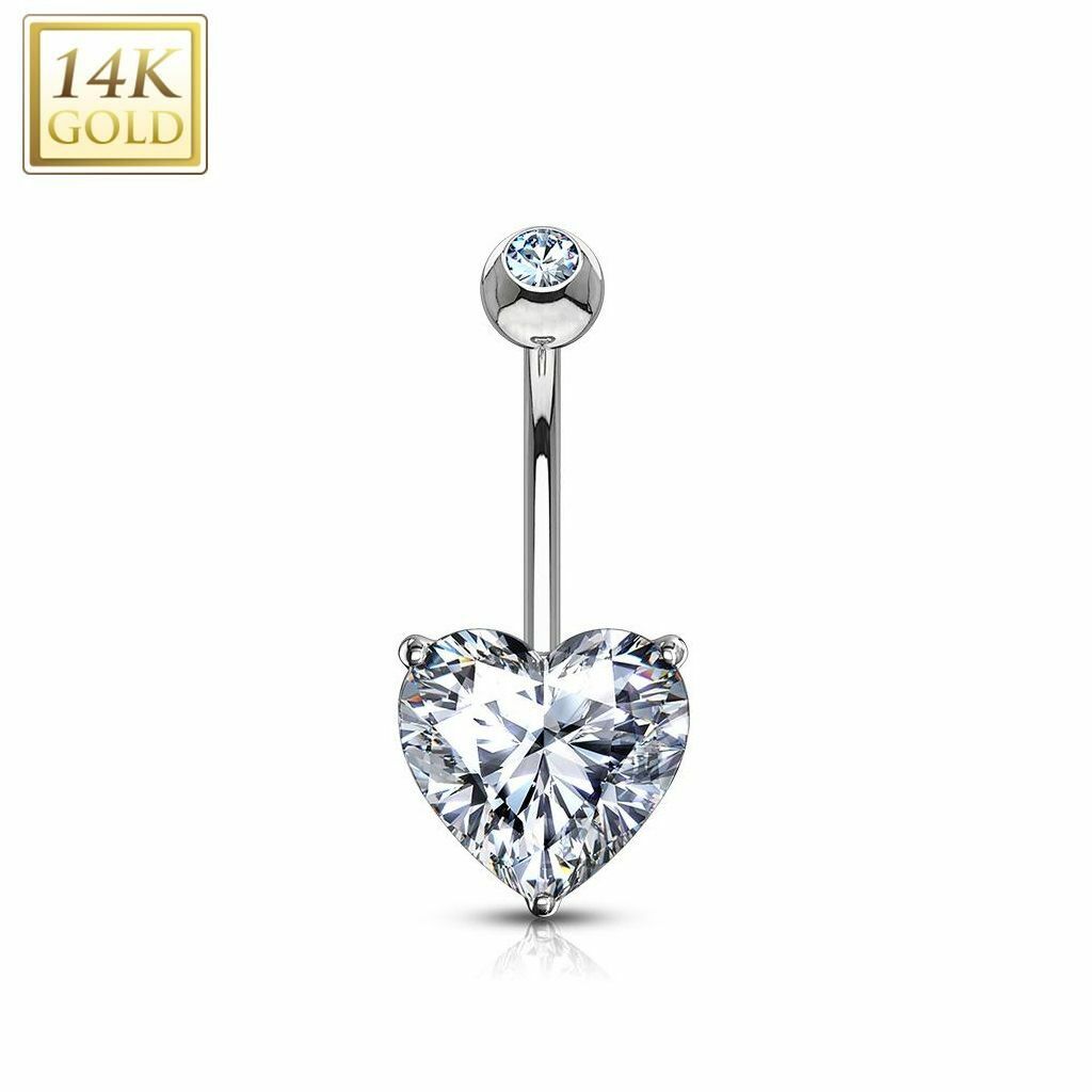 Heart CZ Prong Set 14 Karat Solid Gold Belly Button Ring 14ga