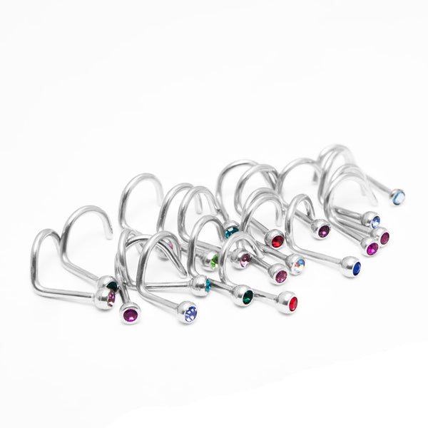Nose Piercing Jewelry Mix - 10 Assorted CZ Gem Nose Screws - 18ga 316L Steel