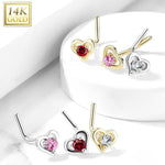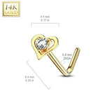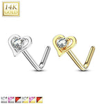 Nose Ring L-Bend with Prong Set Round CZ Center Hollow Heart 14Kt Solid Gold 20g- Sold Each