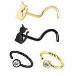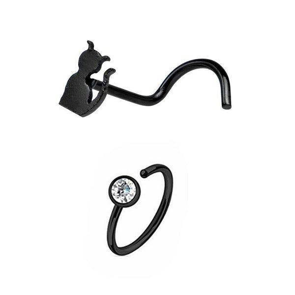 Nose Rings Pack of 2 Cat Design Nose Screw & Anodized Nose Hoop with CZ 20ga Surgical Steel