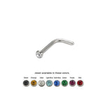 This is an "L Bend" nose stud made from 316L high grade surgical steel with a bazel Set 1.3 mm gem available in your choice of light blue, dark blue, orange, green, purple, red, or clear.
