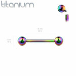 Our Luxe Modz Collection just got a bit more exclusive with this item. Introducing our new internally threaded titanium barbell. This item features a 14ga Grade 23 barbell that comes in 7 colors: purple,blue, green, gold, black,rose gold, and multi-color. Two available lengths , 1/2-12mm & 5/8-16mm, both come with 5mm end balls. Perfect for nipple and/or tongue piercings. Sold Individually. We use Ti-6AL4V-ELi ASTM F-136(Grade 23) *IMPLANT GRADE* titanium in all of our Titanium Body Jewelry.