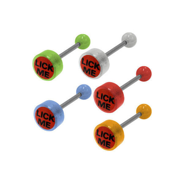 This is a Lick Me logo flat head straight barbell tongue ring made with a 316L surgical steel shaft and uv acrylic beads.