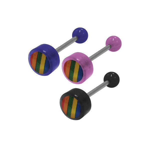This is a rainbow logo flat head straight barbell tongue ring made with a 316L surgical steel shaft and UV acrylic beads.