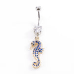 14g-7/16"(11mm) Belly Navel Ring with Blue and Gold Seahorse Dangle Charm
