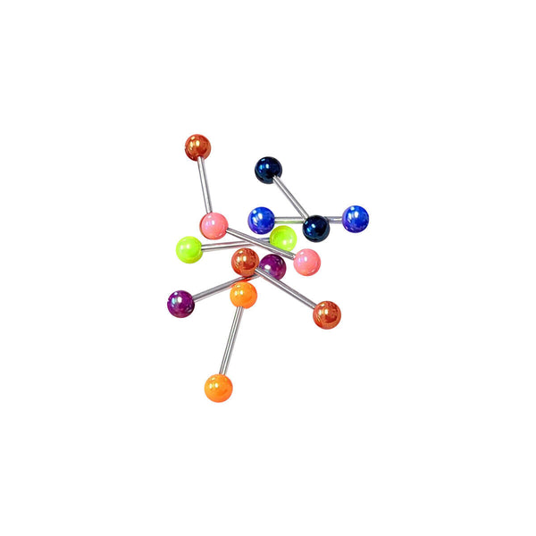 5 Pack of Metallic Pearlescent Acrylic Tongue Nipple Rings 14 Gauge Randomly chosen colors - no duplicates in each pack of 5. Externally threaded. 14g thick 16mm - 5/8" length...