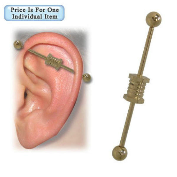 Anodized Titanium 14G Industrial Barbell with Sewing Thread Design Description This is an interesting spool design in a gold color titanium industrial barbell anodized over 316L surgical steel with two...