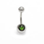 Features pot leaf logo with black backgroud belly ring