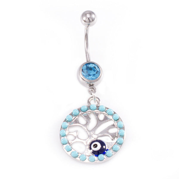 Belly Button Rings Tree of life Dangle Design with Aqua CZ Jewels / Navel