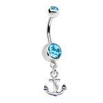 Belly Navel Ring - Aqua CZ Gems with Anchor Dangle - 14ga 316L Surgical Steel