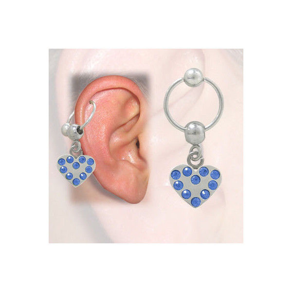 Body jewelry, cartilage - tragus earring, 316L surgical steel with heart design and blue jewels.