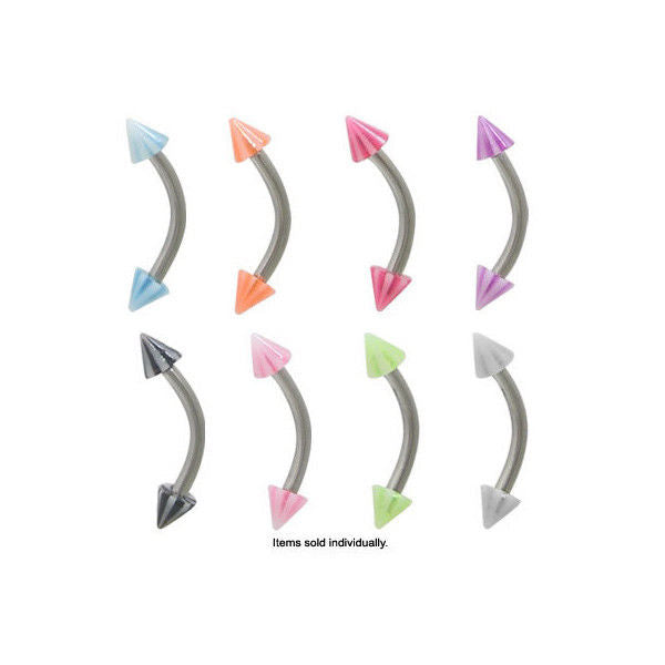 Curved Barbell 16G Eyebrow Ring with Spike Acrylic Bead End - 8 Colors Available Description Curved barbell eyebrow ring. 316L high-grade surgical steel shaft with UV (ultraviolet) sensitive acrylic replacement...