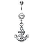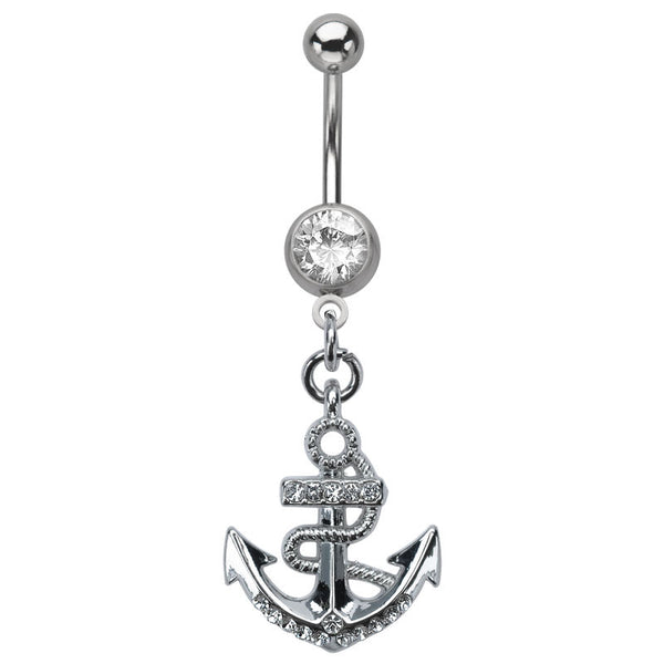 Dangle Anchor Belly Ring with Clear CZ Gems DESCRIPTION This is an Anchor belly button ring.316L Surgical steel curved barbell with a dangling anchor and clear cubic zirconia gems.Size thickness...