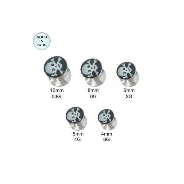 This is a wicked ear gauge made from 316L surgical steel that is screw fit with a white skull cross bone logo design.