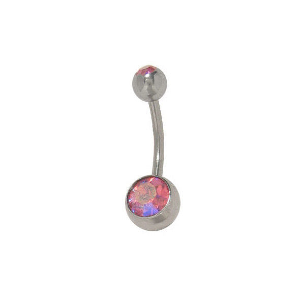 Double Jewel Belly Button Ring High Polish Surgical Steel 14G DESCRIPTION This is a glamorous belly button ring with a 316L high polish surgical steel and dual Aurora Borealis pink...