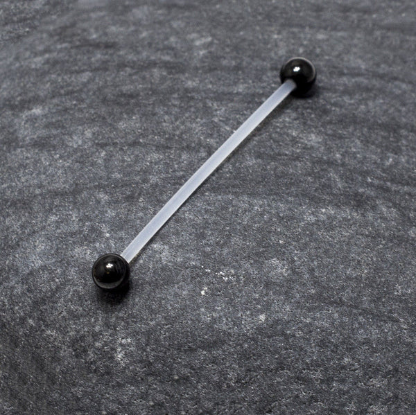BODY JEWELRY ONLINE Industrial Barbell Clear Retainer Bioflex Ear Bar Titanium Ball 14G 38mm 1.5" DESCRIPTION This is a Clear Industrial Barbell Retainer Shaft with 4mm Titanium Black Ball Ends....