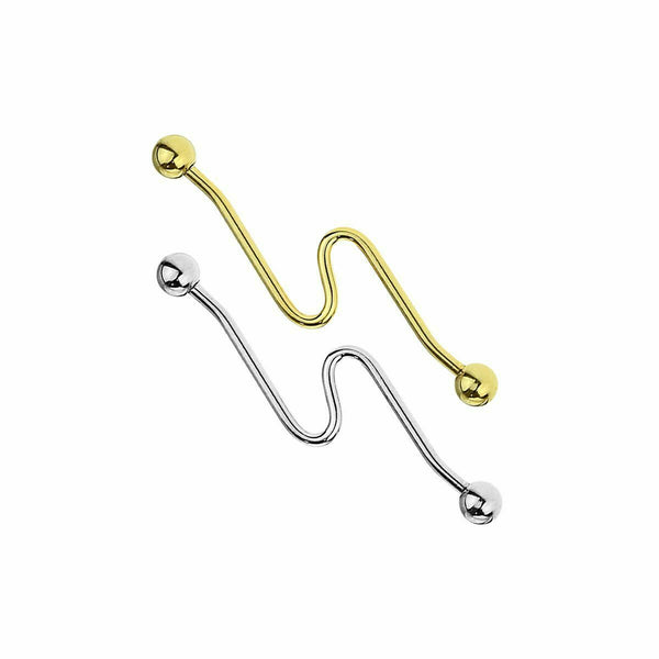 Industrial Barbell Deep Waved Surgical Steel scaffold piercingsAvailable Size: 14 gauge 1 1/2 inch 38 mmBall size: 5mmAvailable Color: Gold and Silver