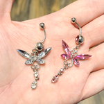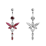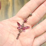 Large CZ Butterfly Dangle Navel Belly Ring Surgical Steel 14g - Sold individually 14g 7/16" - 11mm shaft 35mm dangle 28mm at widest points Color: Pink Clear