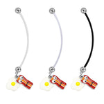 Flexi acrylic belly button ring for +size 14g/1.6mm with 5mm steel balls and a cute bacon with eggs dangling part. 50mm length, can be cut and threaded to fit 3...