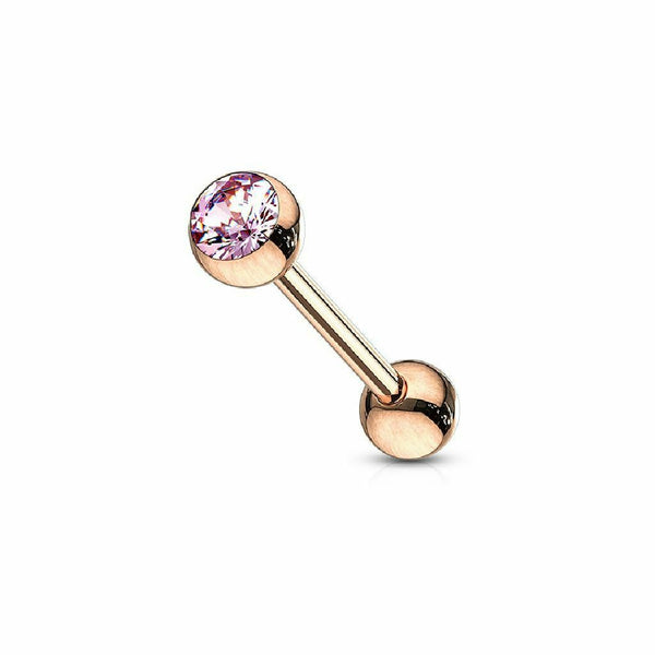 Rose Gold IP Over Surgical Steel Tongue Barbell with Crystal Set Ball 14ga Sold Each DESCRIPTION This item features your choice of color . Each surgical steel barbell Measurement: 14...